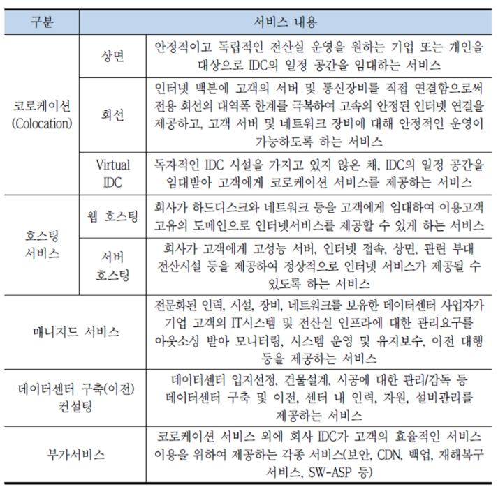 데이터 센터: 서버, 스토리지 등의 ICT 장비를 건물,공간에 중앙 집중식으로 집적시켜 IT 서비스 제공에 필요한 장비를 통합, 관리하여 안정적으로 운영하고, 24시간 365일 무중단으로 운영하는 시설을 말함
