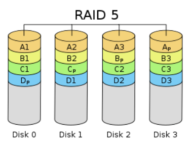 RAID 5: 바이트 수준의 데이터 스트라이핑. Parity bit(오류 검출 기능)가 하나의 디스크 오류가 발생하면 데이터 무결성을 보장한다. (분산처리)