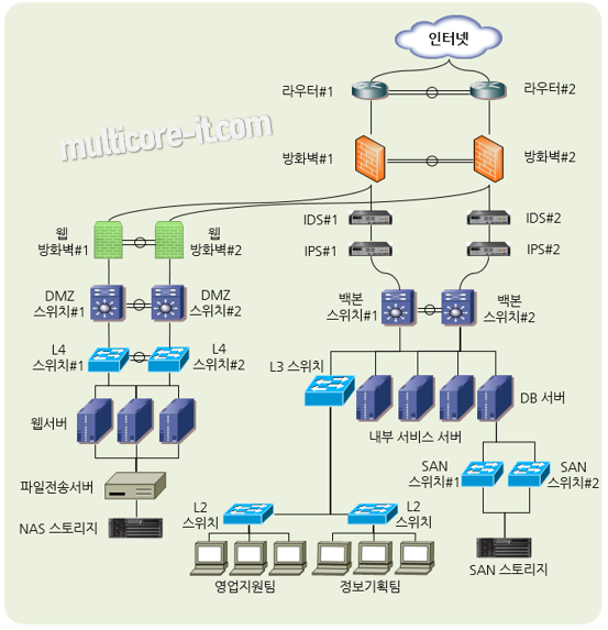 - 백본 스위치: L3들을 연결, 백본 스위치는 L3 스위치들을 연결하는 스위치로서 대규모 네트워크에서 사용