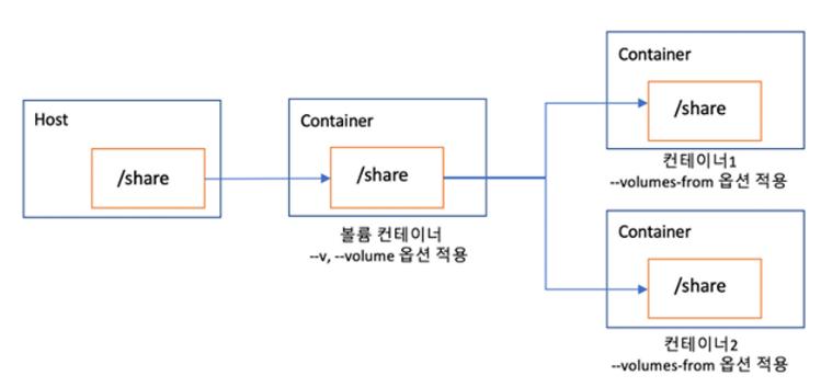 [볼륨의 이름]:[컨테이너 공유디렉터리] 형식으로 해서 컨테이너를 만들어 줄 수 있다. 볼륨 컨테이너처럼 여러 개의 컨테이너에 공유되어 사용될 수 있다.