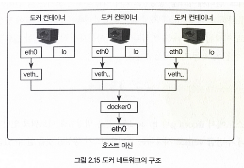 도커 컨테이너의 eth0 인터페이스는 호스트의 vethXX와 연결된다. veth 인터페이스는 docker0이라는 브리지에 바인딩돼 외부와 통신할 수 있다.