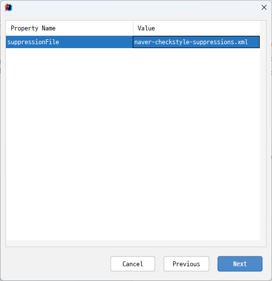 suppressionFile 프로퍼티 값으로 naver-checkstyle-suppressions.xml을 입력한다.